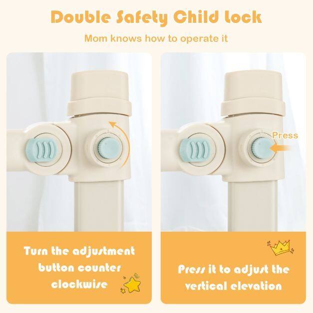 Independent One-side Lift Operation: The smooth one-side lift is convenient for parents to lift vertically at any time and care for babies with no need to disassemble. Equipped with double safety child lock, the bedrail allows you to lift and put down it by one twist and one press, which effectively prevents baby’s mistakenly touch.