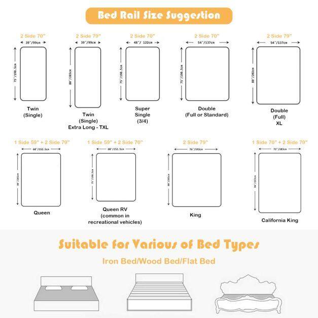Dimensions and Great Compatibility: Our bed rail is suitable for double twins, queen & king beds, full size beds, single mattress and more. There is only one side rail in each package. If you need an all-round protection, you should buy 4 pieces. Please check your bed size before buying.