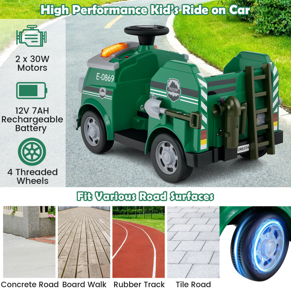 ● High Performance Ride-on Car: The ride-on fire truck features a powerful 12V rechargeable battery and double 30W motors, ensuring smooth and steady driving. Additionally, the 4 threaded wheels can handle various terrains, including concrete roads, rubber tracks, tile roads, and boardwalks.