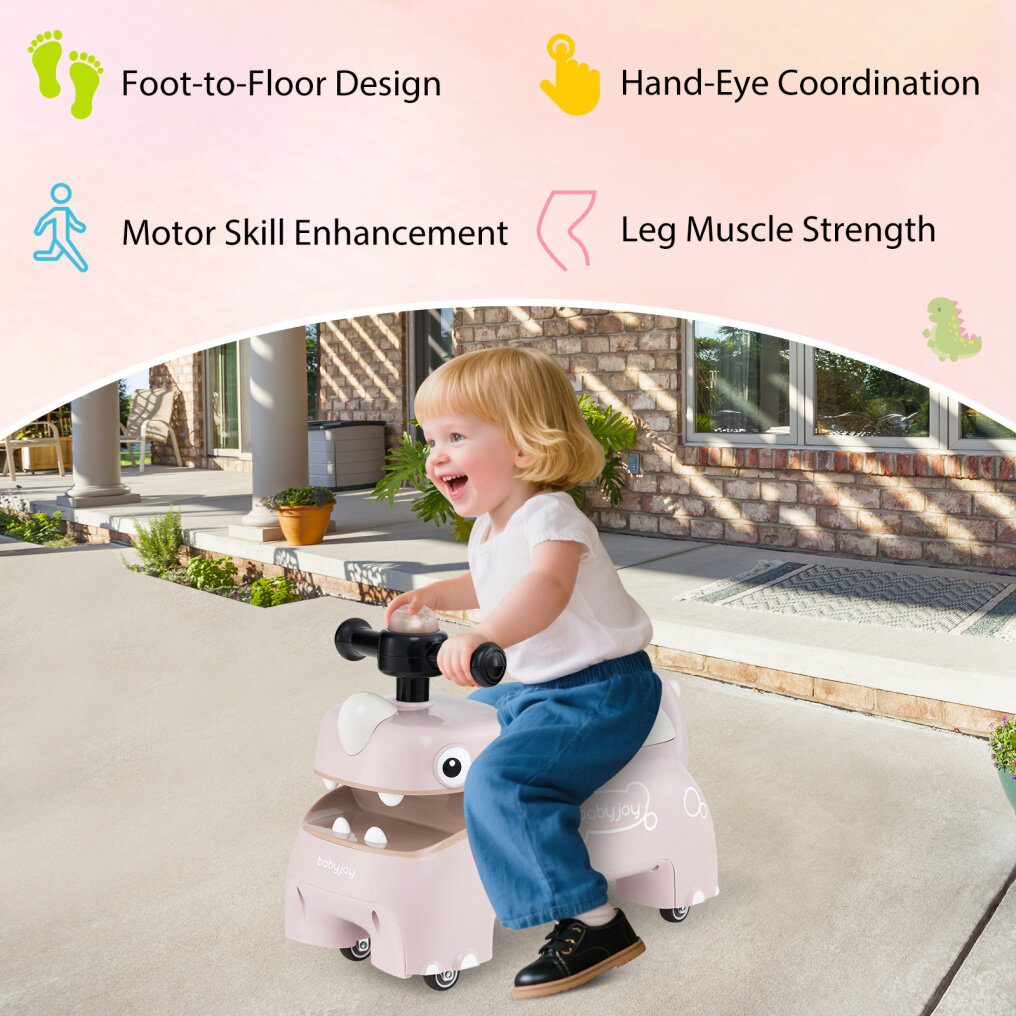 This foot-to-floor sliding car features an adorable dinosaur-themed design with press-able teeth, ideal for kids above 18 months old. It is fun to ride thanks to 6 engaging sounds and flashing LED lights. The universal wheels make it easy for little ones to ride both indoors and outdoors. Prioritizing stability and security, the sit-to-stand riding racer includes 4-wheel support, a low center of gravity, and widened wheelbase. The spacious seat allows your child to ride comfortably, and there is an underneath storage compartment for their belongings. Not only is this walking car toy fun, but it also helps toddlers develop muscle strength, motor skills, and other growth benefits. If you are looking for such a product, do not hesitate to buy it!