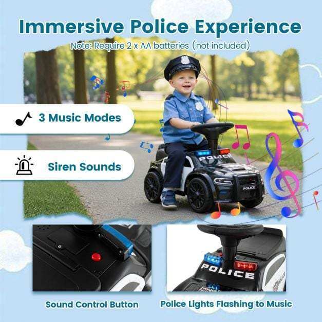 ● Immersive Police Experience: This police kids push ride on car provides an authentic police driving adventure with siren sounds and flashing lights. As kids maneuver the car, the sounds and lights synchronize to 3 different music modes, enhancing their imaginative play and making every ride thrilling.