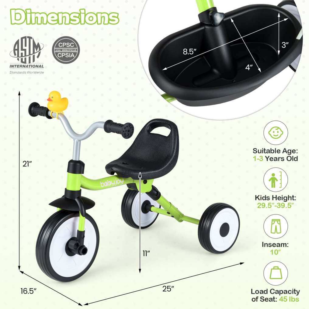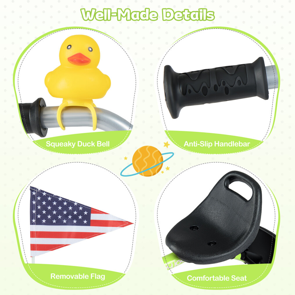 Extra Surprises Included: A spacious rear storage basket carries favorite toys, while the squeaky duck bell adds a touch of whimsy to every ride. More, the tricycle comes with a removable flag that makes it easy to spot your little adventurer from afar.