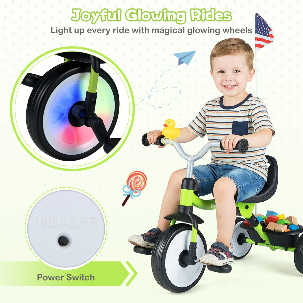 Joyful Glowing Rides: Set this toddler tricycle apart with dazzling rainbow LED wheels that light up magically as your kid rides. Every adventure becomes more exciting and playful, while enhanced wheel visibility ensures extra safety.