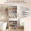 【Adjustable 3-Tier Shelf】The adjustable shelf behind the lower door can be set to 3 different heights, allowing you to customize the space for storing towels, toiletries, or other items. The gap between each level is 6.4 cm.