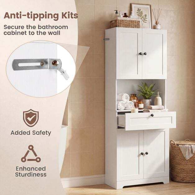 Elevate your space with this functional and stylish bathroom cabinet! It features two cabinets, one open compartment, and one large drawer for efficient organization of your bathroom essentials. The three-tier adjustable shelf offers customizable storage for items of varying sizes. Perfect for the bathroom, laundry room, kitchen, or living room. Designed for safety and stability, the cabinet has a wide base, anti-tip kits, and non-slip feet. Convenient handles and soft-close hinges ensure smooth opening and closing of the doors. The smooth surface is easy to clean after use.
