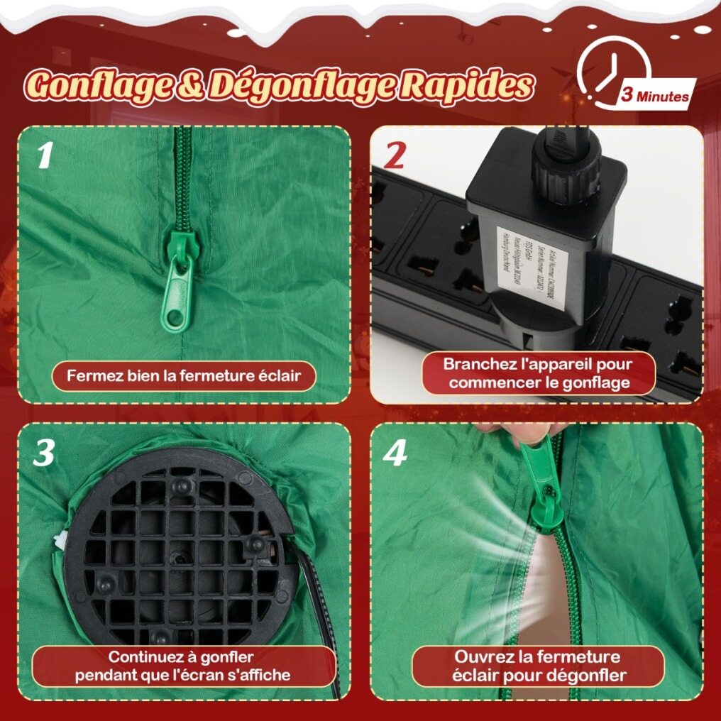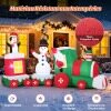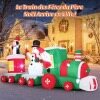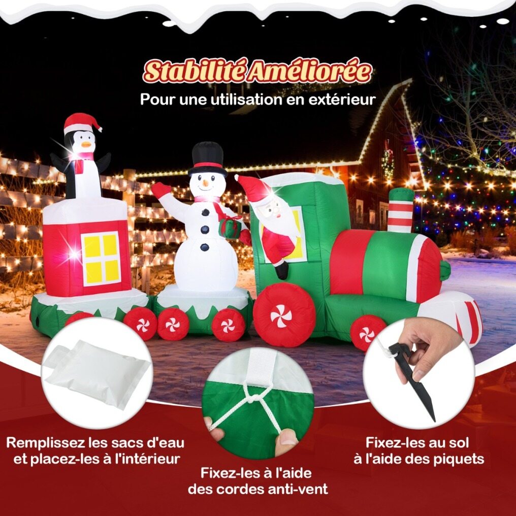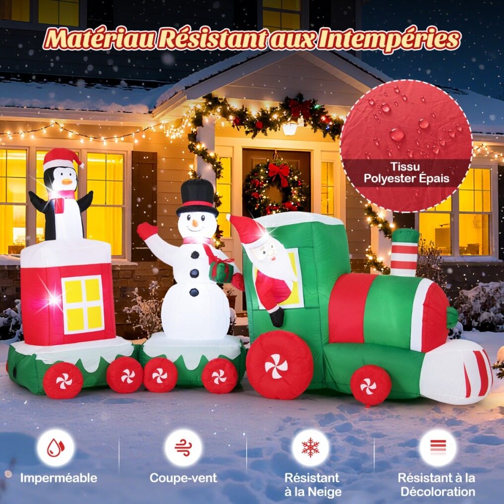 Bring festive excitement to your holiday décor with this large inflatable Christmas train! This train features Santa Claus as the conductor, a snowman waving while holding a gift box, and a playful penguin—all designed to bring endless joy to your outdoor decorations or events. With 7 bright LED lights, the train illuminates beautifully at night. Made from heavy-duty polyester, this inflatable ensures reliable use. The built-in fan inflates the train in approximately 3 minutes, while the wind ropes, ground stakes, and water bags ensure stability. Perfect for gardens, patios, parties, school events, or community spaces, it creates an impressive centerpiece for the holidays.