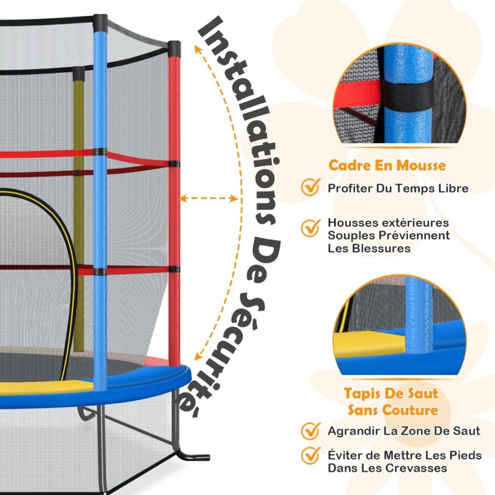 【Built with Many Thoughtful Details】The trampoline net has a zippered door for kids to get in and out. And the transparent design of the net allows you to easily monitor the kids in the trampoline from a distance. In addition, the 6 galvanized steel pipes are filled with EPE foam, which can prevent your child from getting injured by accident while jumping.