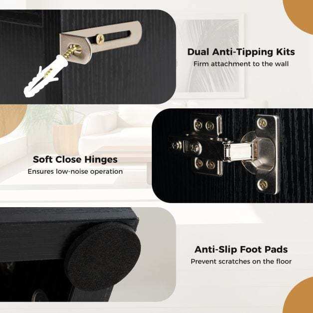 ● Reliable Construction: Made of selected boards, the wooden TV cabinet supports up to 480 lbs. Moreover, the anti-tipping kits secure the unit safely. The stand also has soft-closing hinges that protect fingers and anti-slip foot pads to protect the floor.