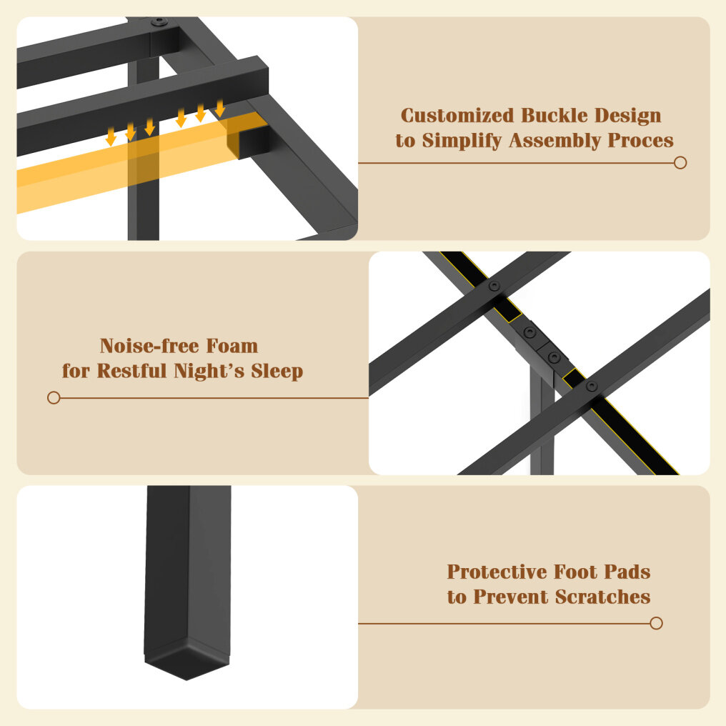 ● Robust Metal Frame: Constructed with heavy-duty metal slats, the platform bed boasts a strong weight capacity up to 485 lbs/660 lbs/660 lbs/1100 lbs. Additionally, the metal legs with non-slip foot pads offer great support, enhancing overall stability.