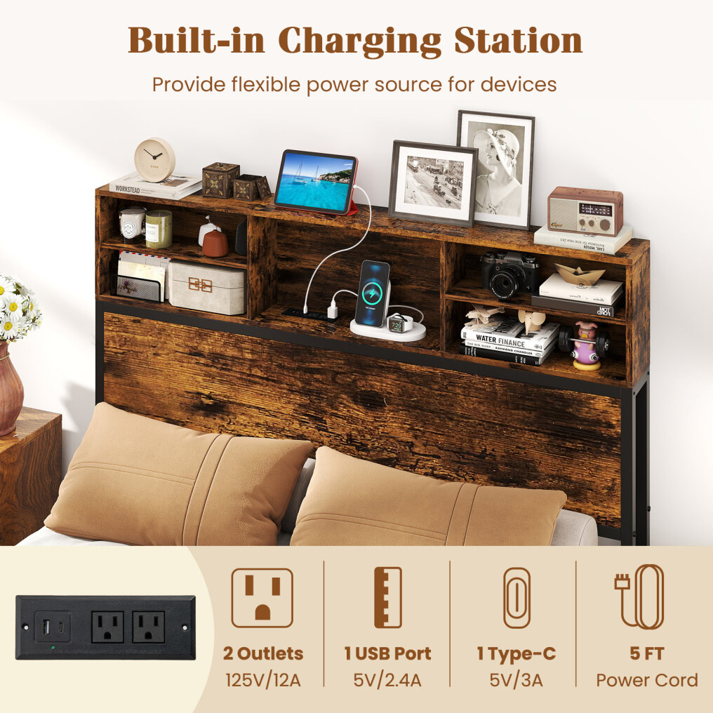 ● 2-in-1 Storage & Charging Headboard: This bed frame features a storage headboard with 3/5 cubes that provides convenient space for storing your essentials. Moreover, the built-in charging station (2 outlets, 1 USB port & 1 type-C) keeps your devices powered up and easily accessible.