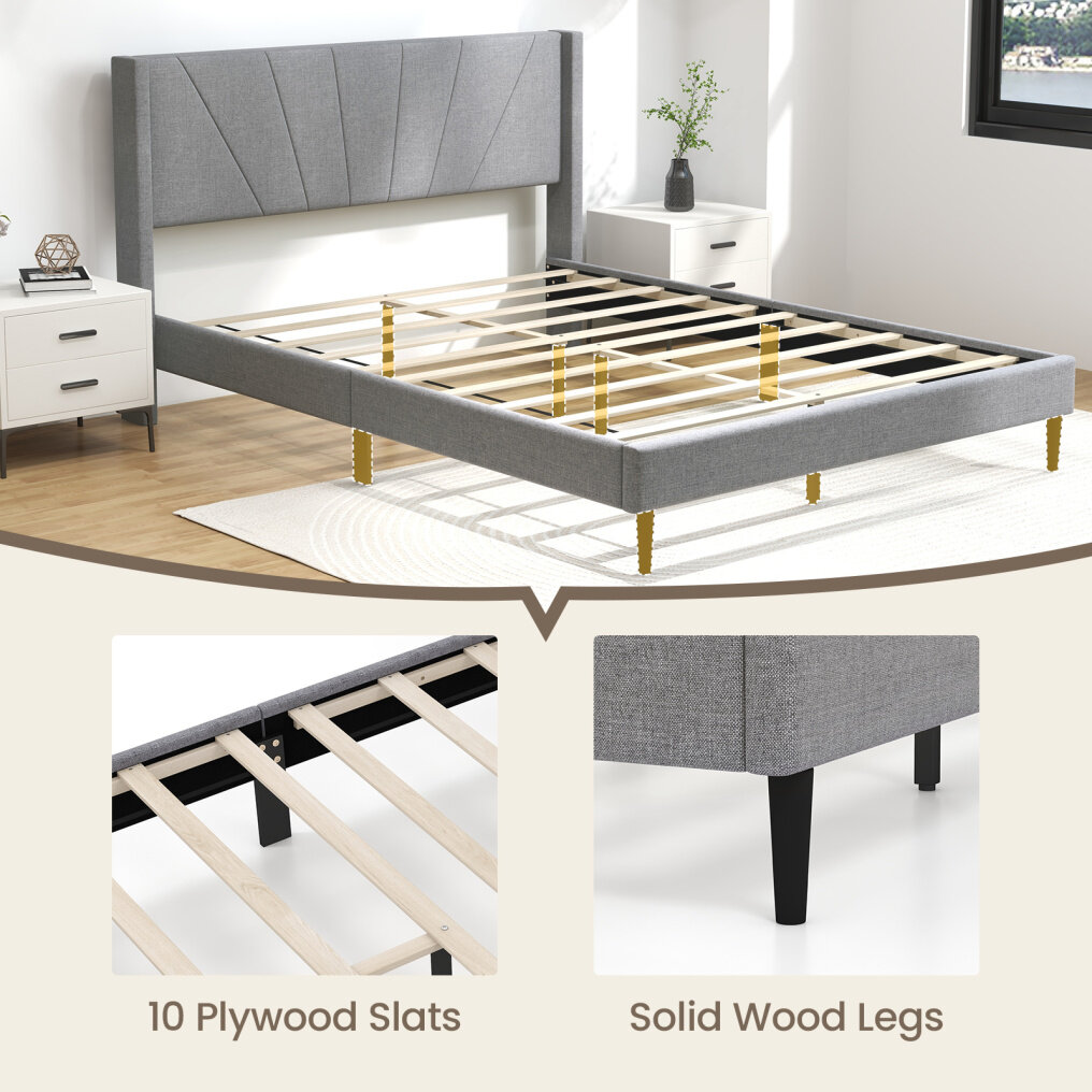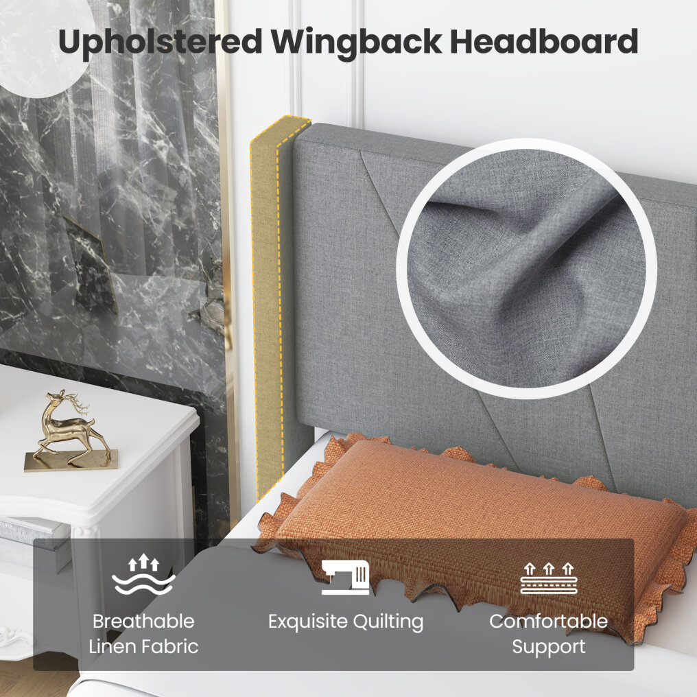 ● Chic Wingback Design: This upholstered bed frame boasts a sophisticated wingback headboard that adds a touch of modern elegance to any bedroom. Plus, the comfy headboard also offers comfortable support for reading or relaxation.
