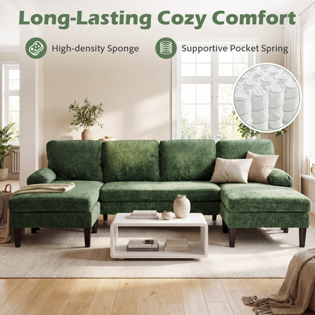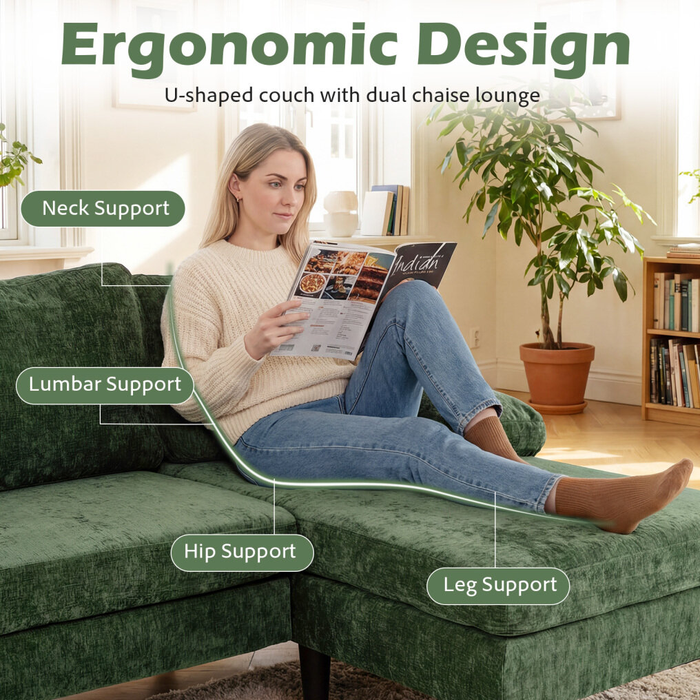 ● Large U-Shaped Couch: Measuring a spacious 101.5" x 49.5" x 28.5", this sectional couch snugly seats up to 6 people. The U-shaped design with double chaises lets you stretch out and relax your legs, making it a cozy centerpiece for any living room or office lounge.