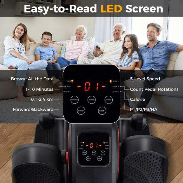Intuitive Display and Controls: The leg exerciser has an easy-to-read LED display screen that shows real-time data including time, distance, calories burned, and pedal rotation count. It also features a remote control with shortcut buttons for convenient adjustment of settings during the workout.