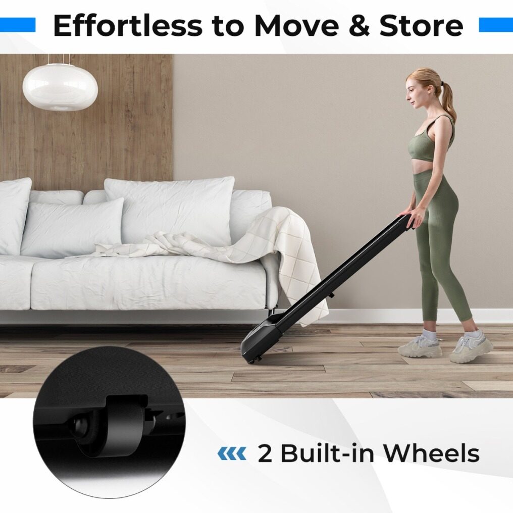 Simple Movement & Storage: With 2 built-in wheels and 15cm thickness, this portable walking treadmill not only facilitates movement but allows you to simply store it for space-saving design.