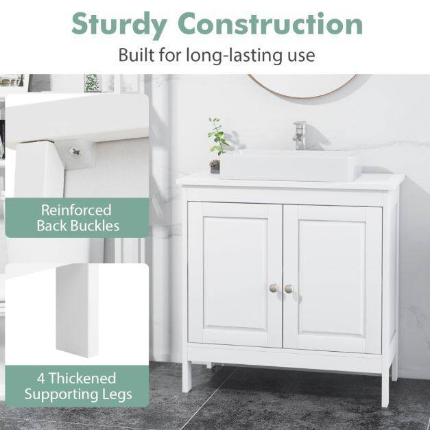 Sturdy Construction: Crafted from high quality board material, this freestanding under sink cabinet ensures great stability and is built for long-lasting use. Additionally, 4 thickened supporting legs and reinforced back buckles make the cabinet more stable.