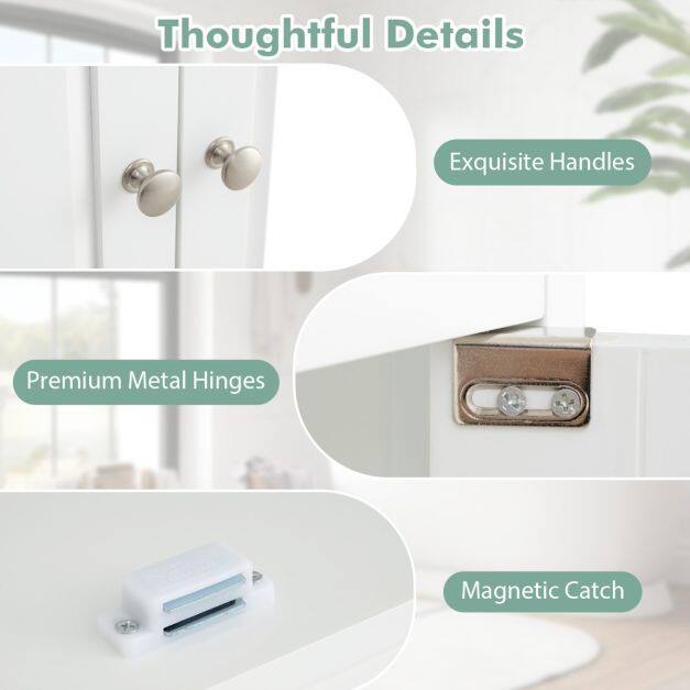 Thoughtful Details: Equipped with a magnetic catch and premium metal hinges, the cabinet doors protect your stored items from dust and moisture for long-term storage. Besides, the exquisite handles are designed for convenient door opening and closing.