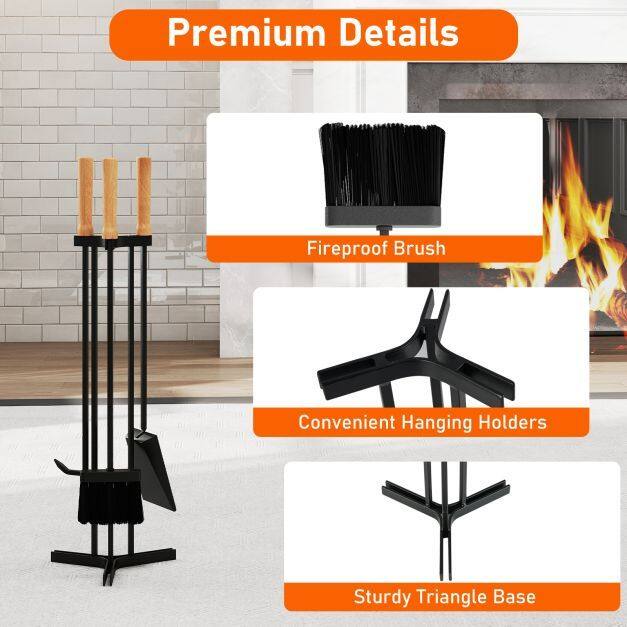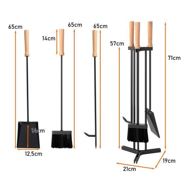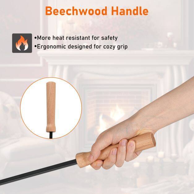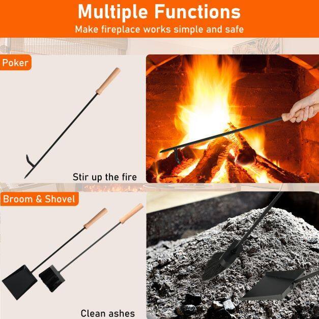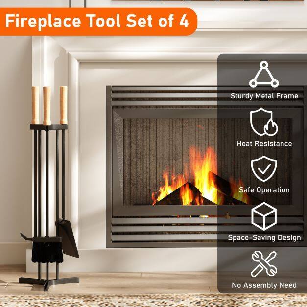 Enhance your fireplace experience with this 4-piece tool set, designed for multiple uses. It includes a sturdy poker, broom, and dustpan, making fireplace work simple and safe. All three tools have heat-resistant beechwood handles for added safety and an ergonomic, comfortable grip. Additionally, the sturdy metal frame and stable triangular stand ensure long-lasting reliability and durability. Ready to use right out of the box, this essential set with quality details makes tending to your fireplace easy and enjoyable every time.