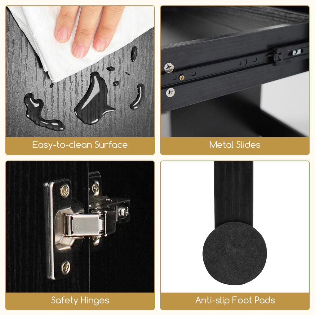 ● Abundant Storage Space: There are 3 open shelves, 3 compartments, 1 small drawer, 1 larger drawer, and 1 single-door cabinet to display or hide your cosmetics, skin care products, and beauty tools. The spacious desktop keeps your daily essentials within reach. Plus, the hair dryer rack will be a nice place to store your hair dryer.