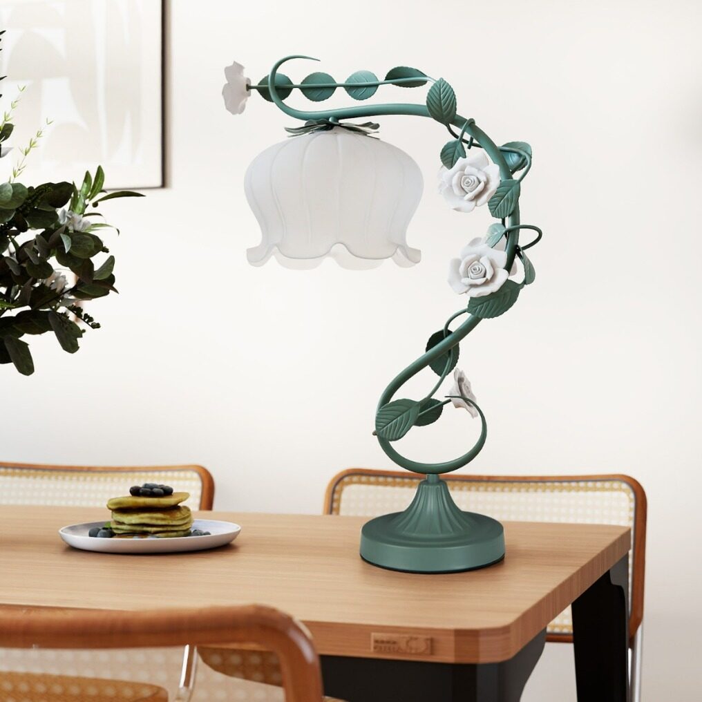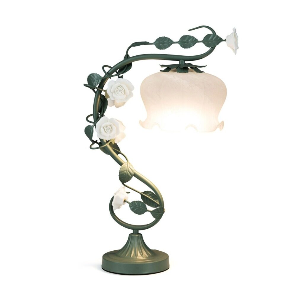 【Flowering Elegance】This vintage bedside lamp features a glass shade adorned with a lily of the valley motif intertwined with vibrant green leaves, 6 white ceramic roses, and tendrils. Its captivating appearance brings life and sophistication to your living space.