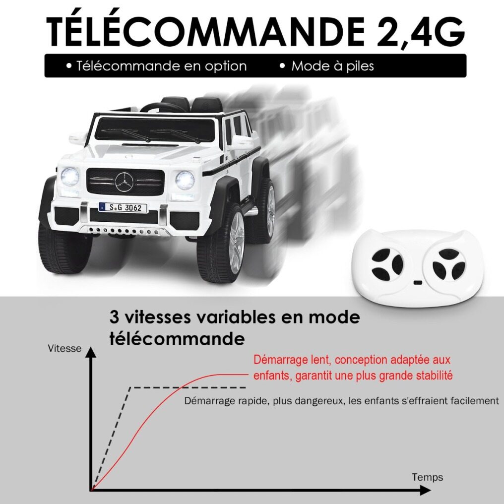This powerful car is perfect for little racers! The two modes mean it can be driven manually or controlled by parents using a remote control. There are three speeds and the option to drive forward or backward. The two doors have locks and, together with the seat belt, ensure the child's safety. The slow acceleration and gentle start ensure that little ones don't lose their balance. External devices can also be connected to the car to play music. If the battery is too low, the car can also be pulled using the handle. Your little one will have a lot of fun with it!
