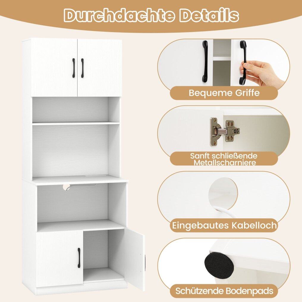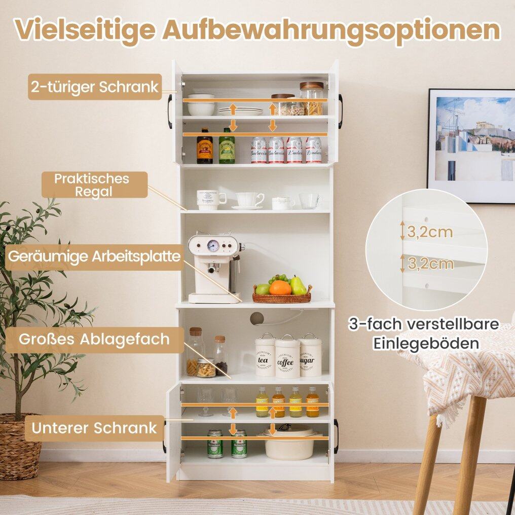 Maximize your kitchen's functionality with this chic, space-saving pantry! Featuring various storage options, including a 2-door cabinet, a convenient shelf, a spacious countertop, a large compartment, a lower cabinet, and 2 adjustable shelves—perfect for your appliances and accessories. It's not just about storage; charge your devices with an integrated charging station neatly tucked away inside! Built to last, this sturdy display cabinet supports up to 90 kg and stands firmly with tip-over protection. Its sleek, tall design fits perfectly into tight corners, making it a brilliant choice for small or busy spaces.