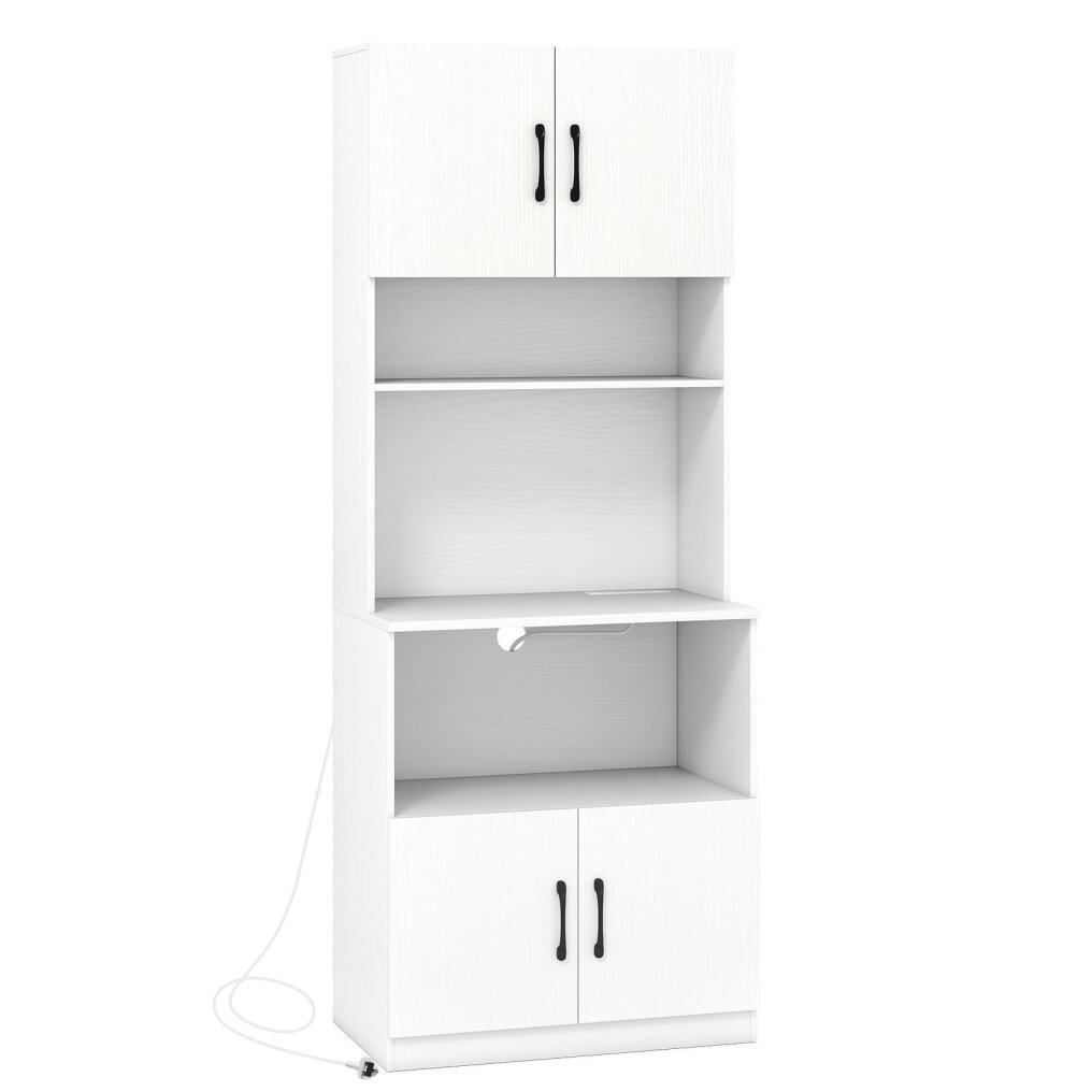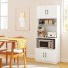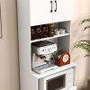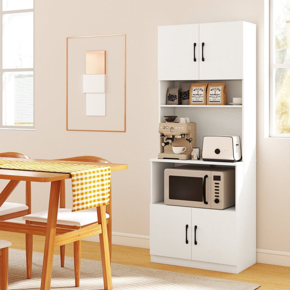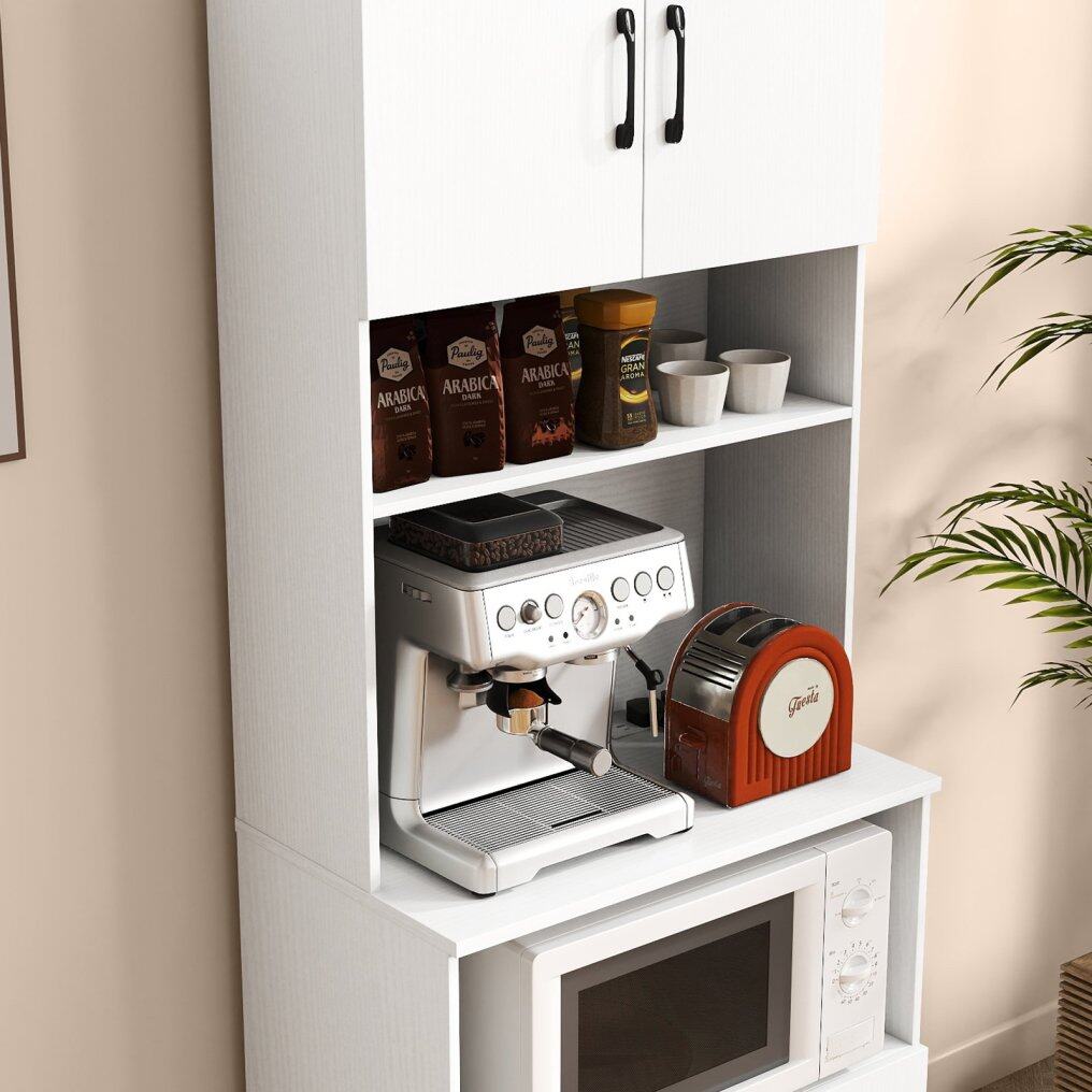 Ample Storage Solutions: The kitchen pantry cabinet offers generous storage space with two spacious cabinets and a three-tiered open area, ideal for microwaves, coffee makers, mugs, and other kitchen utensils. The two three-way adjustable shelves in the cabinets allow for customizable storage according to your needs.