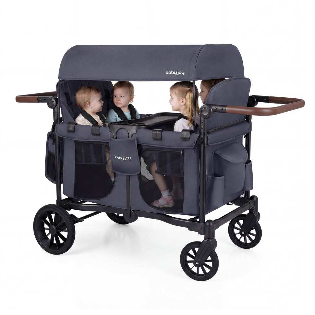 ● Comfortable & Secure Seating for 4 Kids: This wagon stroller comes with 4 detachable and soft padded seats, each featuring a heightened backrest for ultimate support and a 5-point safety harness to keep active toddlers safely in place on bumpy paths. The spacious room inside the stroller enables 4 kids to sit comfortably.