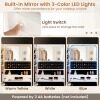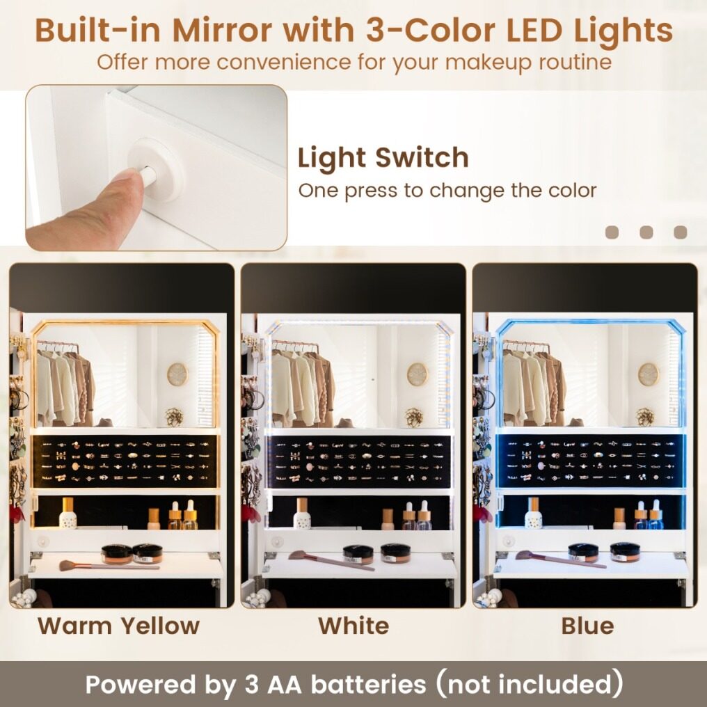 ● LED Lighted Makeup Mirror: The built-in mirror with 3-color LED lights (white, warm yellow, blue) offers more convenience for your makeup routine. The lights turn on automatically when the door opens and only require one press to change the color through the light switch. Note: powered by 3 AA batteries (not included).