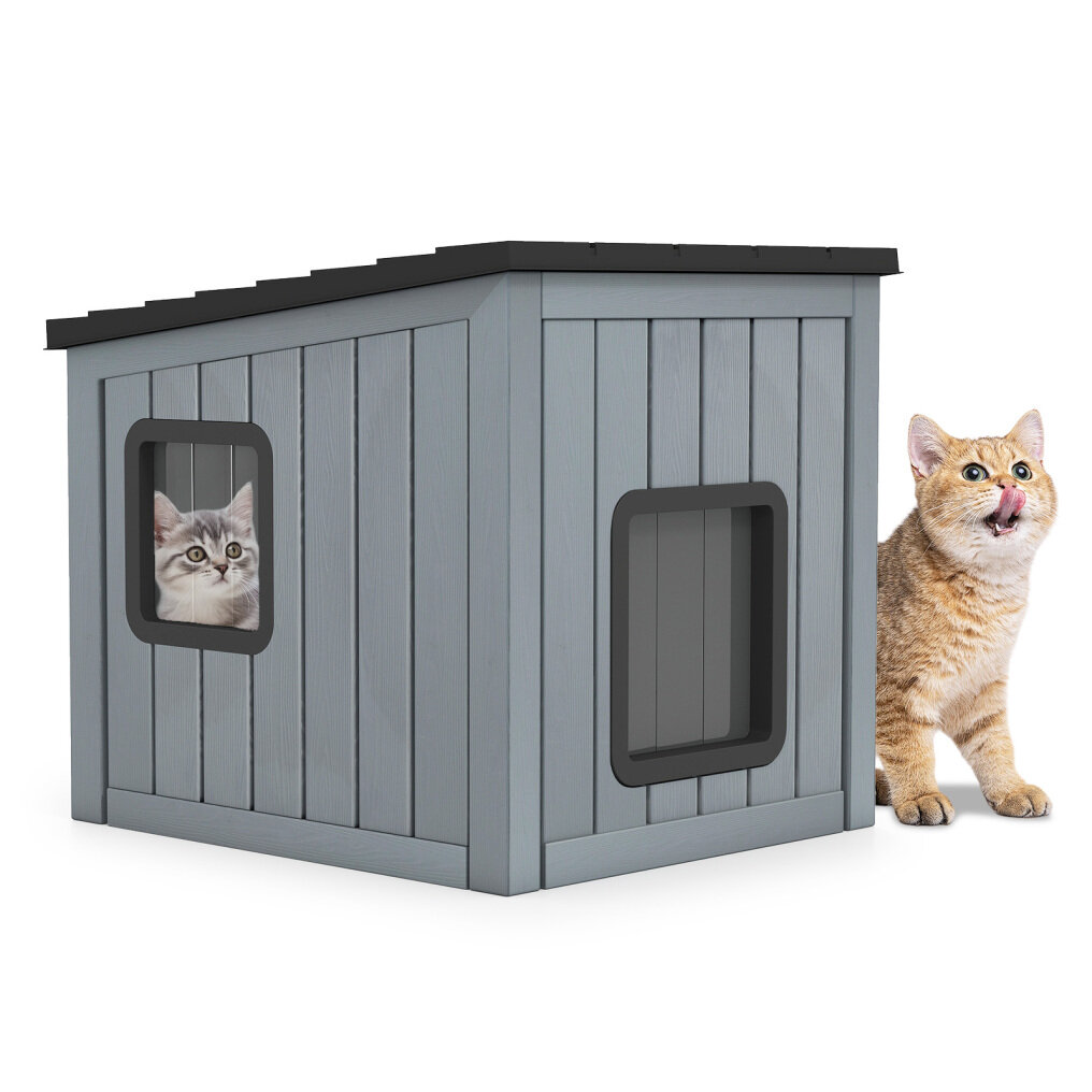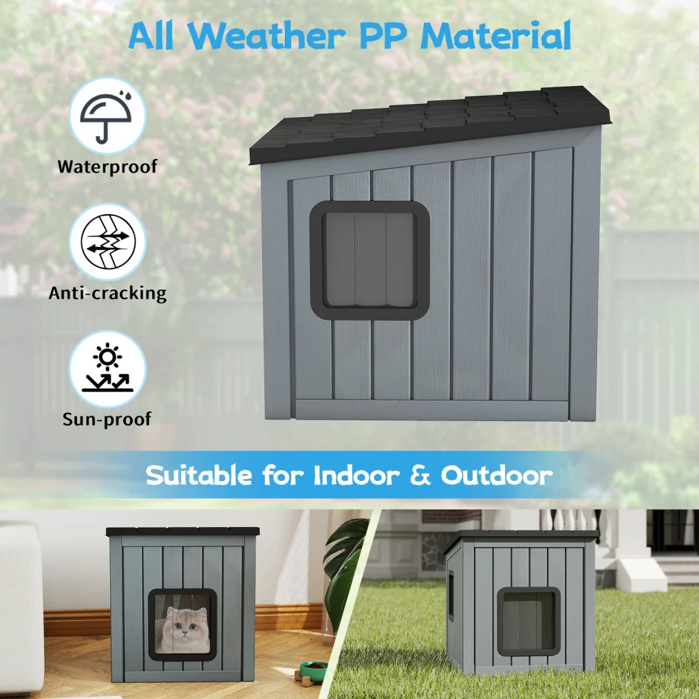 A versatile indoor and outdoor shelter for your furry friends. The water-resistant cat house is made of PP, which resists sun damage and fading even after extended outdoor use. The sloped roof allows rainwater to drain easily, while drainage holes prevent water from accumulating inside and facilitate cleaning. Two PVC doors provide good ventilation and facilitate pet entry and exit. The exterior tile-inspired design gives the house a subtle rustic charm that blends seamlessly with indoor and outdoor spaces.