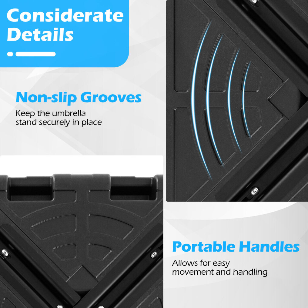 Portability and Non-slip Design: With 2 integrated cut-out handles, the lightweight umbrella base is easy to move, allowing you to adjust its position as needed without strain. Furthermore, the base includes anti-skid grooves, which significantly improve its grip on various surfaces to prevent any shifting.