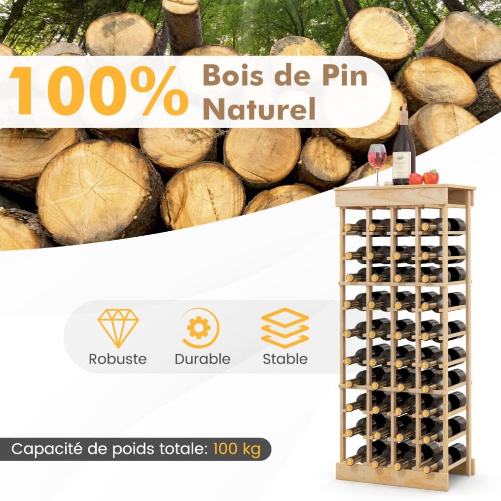 Made of natural pine wood, the wine bottle rack has a total load capacity of 100kg. The 10-tier rack can hold 40 standard wine bottles (750ml). By the way, the top offers the option to place some other items for easy access. And the reinforced crossbars increase the overall stability. In addition, the equipped anti-tip device avoids accidents and creates a safe environment. With a paintable surface, you can design your own wine rack! And the freestanding wine bottle holder can be placed in the kitchen, basement, wine cellar, etc.