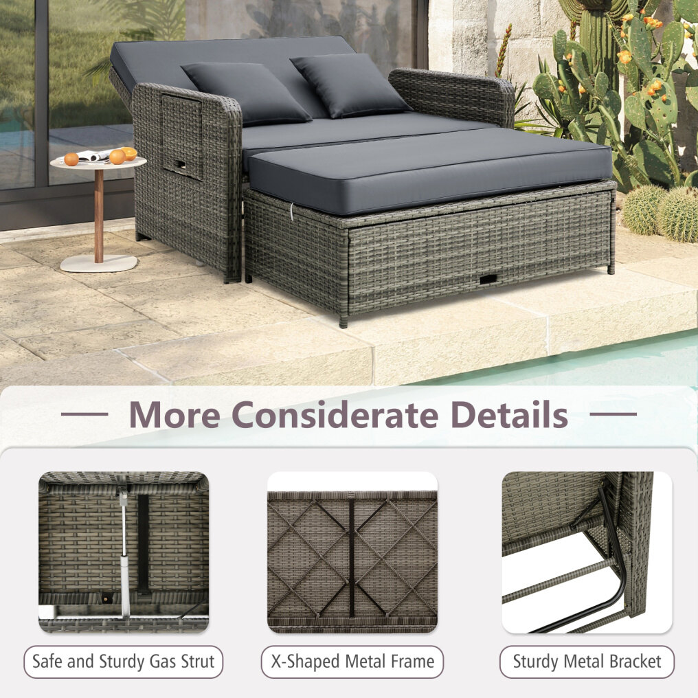 ● 2-in-1 Multifunctional Design: The combination of the loveseat sofa and ottoman allows you to use this patio set as a double chaise lounge / daybed. And with 4-level backrest adjustment, you can sit, recline or even lie flat. Moreover, when the ottoman cushion is removed, you can use this patio set as a double sofa with side table.