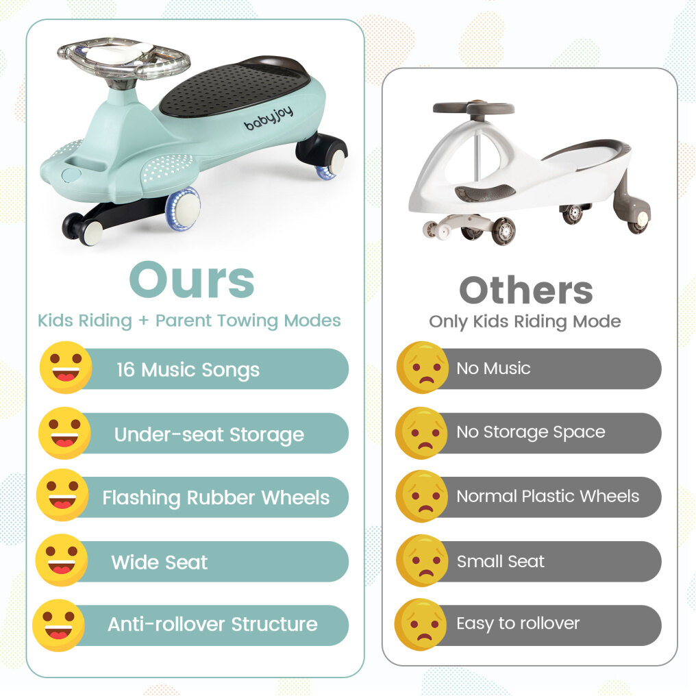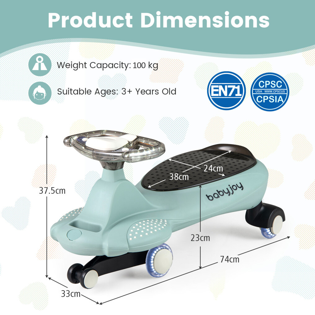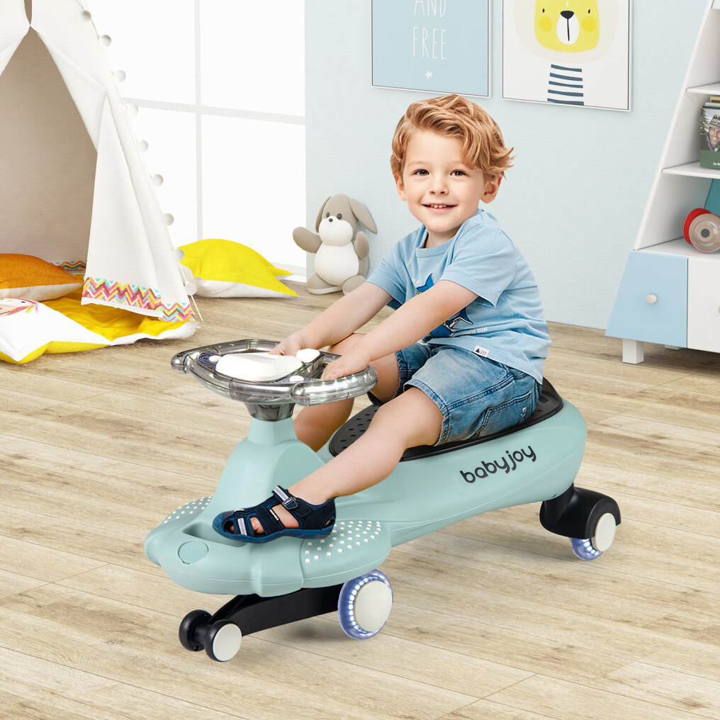 ● Exciting Lights and Sounds: This wiggle car features a steering wheel with 360° rotation, along with engaging light, music, and horn effects to keep your child entertained for hours on end. The rubber wheels create flashing LED lights during movement, adding an extra level of fun with no battery required.
