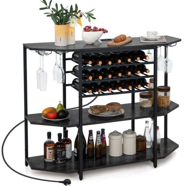 Look no further! This Stylish and Functional Wine Rack with Built-In Charging Station is here to meet all your needs. With glass holders on both sides for 8 glasses, a storage rack for 21 wine bottles, and 3 large shelves for organizing kitchenware, dinnerware, and more, this versatile wine rack is perfect for any space. What sets it apart is the built-in charging station with 2 AC outlets and 2 USB ports, ensuring you never run out of power for your smartphones, tablets, coffee maker, bar accessories. Hence, it not only can be used as a wine rack but also as a bar stand, coffee bar, console table, serving buffet, or storage sideboard. If you are looking for such a product, do not hesitate to buy it!
