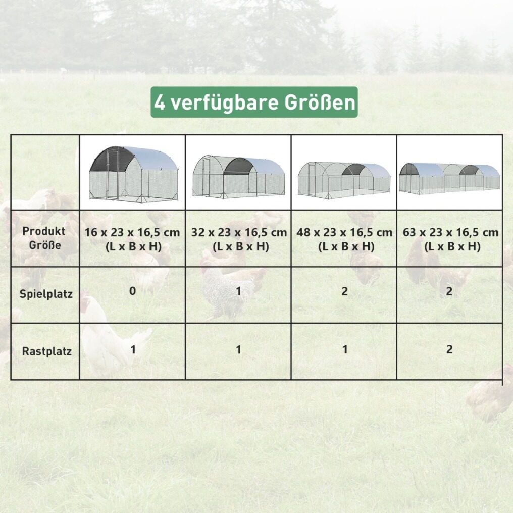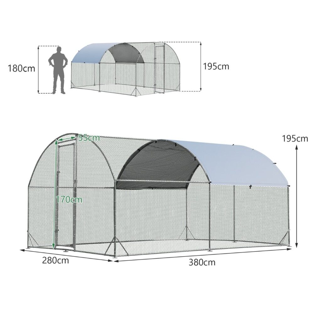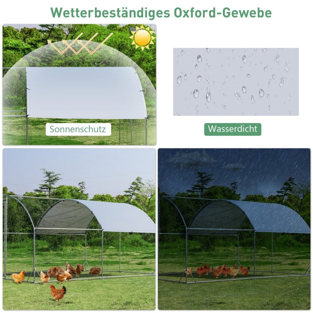 This ultra-large and high chicken coop is very suitable for the garden and farm. Many chickens can play in the coop during the day, rest at night, eat meals and more, which is not only safe for chickens but also convenient for you. In addition, the lockable door allows access to the basket for feeding and cleaning and also prevents chickens from escaping. The poultry cage is made of rustproof galvanized steel frame and high-strength hex wires, which are sturdy and durable for long-term use. Stable triangular reinforcements and ground spikes are attached to the underside of the animal enclosure, which ensure high stability even in bad weather. In addition, the waterproof and sun-proof Oxford cover protects the poultry from sunburn, rain, snow and dirt