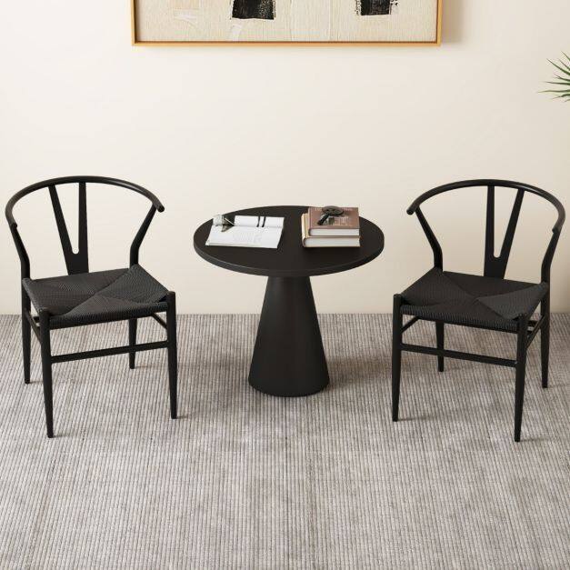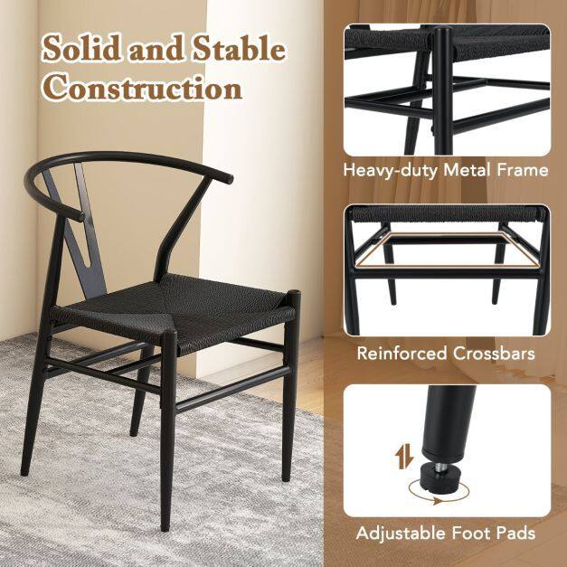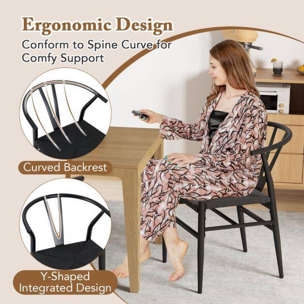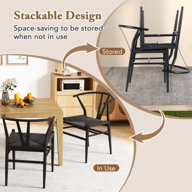 Our wishbone dining chair set adopts Y-shaped integrated backrests and armrests that conform seamlessly to your body shape, ensuring optimal support and reducing back strain during long periods of sitting. Furthermore, the highlight of these chairs is the luxurious kraft paper twine woven seats, offering both comfort and sophistication. Constructed with heavy-duty metal frames and reinforced crossbars, complemented with adjustable footpads, these chairs provide a stable and reliable seating solution for daily use. When the meal is over, you can simply stack one chair on the top of the other, saving available floor space while making it easy to clean the floor. Inspired by mid-century modern aesthetics, featuring curved cutout backs and sleek tapered legs, these chairs are not only functional but also add a touch of elegance to your living space!