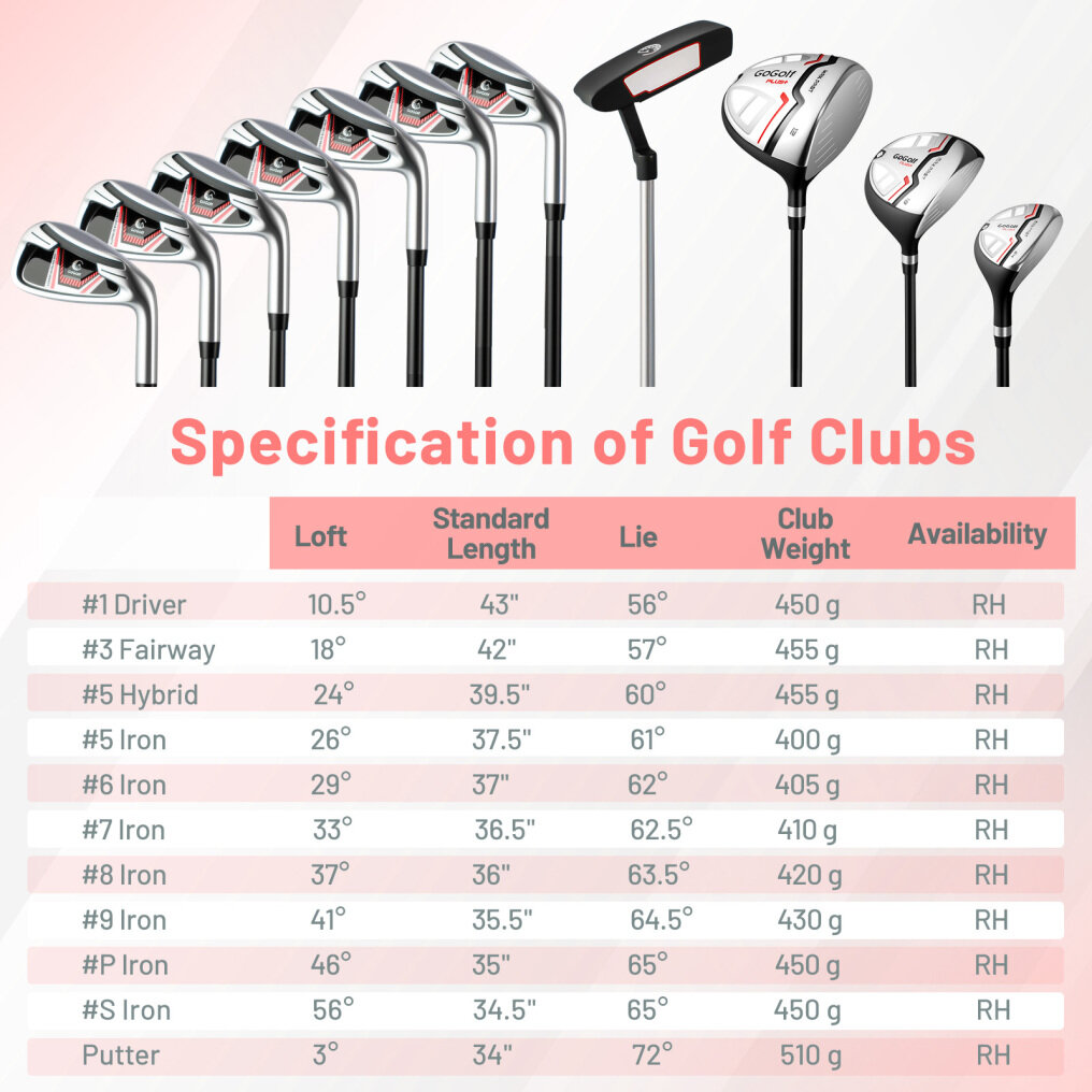 56° (lie), 10.5° (loft), 43" (length), 450 g (club weight) |