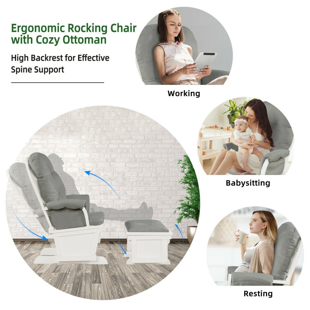 ● Comfy Sponge Cushion and Soft Fabric: This glider and ottoman set is upholstered with thick and high-density sponge padded cushions, which are not easily deformed and can bring you an ultra cozy sitting experience. Besides, the rocking chair and ottoman are covered with soft and skin-friendly fabric for added comfort.