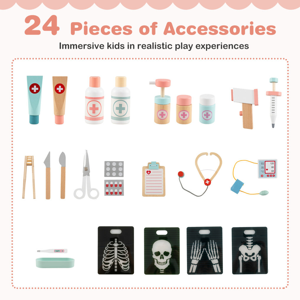 ● Engaging Interactive Experience: From applying medicine and injecting to using a stethoscope for heart checks, the wooden doctor playset offers a hands-on approach to understanding healthcare practices. Besides, it provides the fun of measuring blood pressure and tracking temperature.