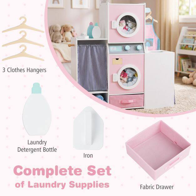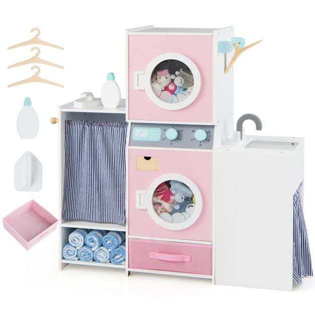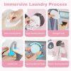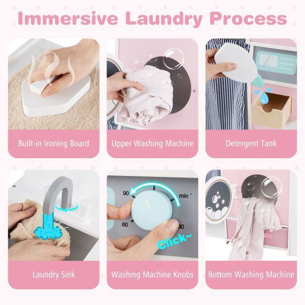 ● Immersive Laundry Process: This immersive laundry pretend toy boasts upper and bottom dual washer units, clicking control knobs, a built-in ironing board, a dedicated detergent tank and a functional laundry sink, plus sliding curtains that add to the scene. This setup lets kids go through every step of laundry from loading clothes to ironing and hanging, with realistic laundry details that make the play feel genuine.