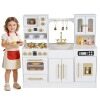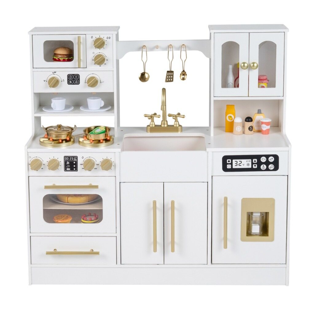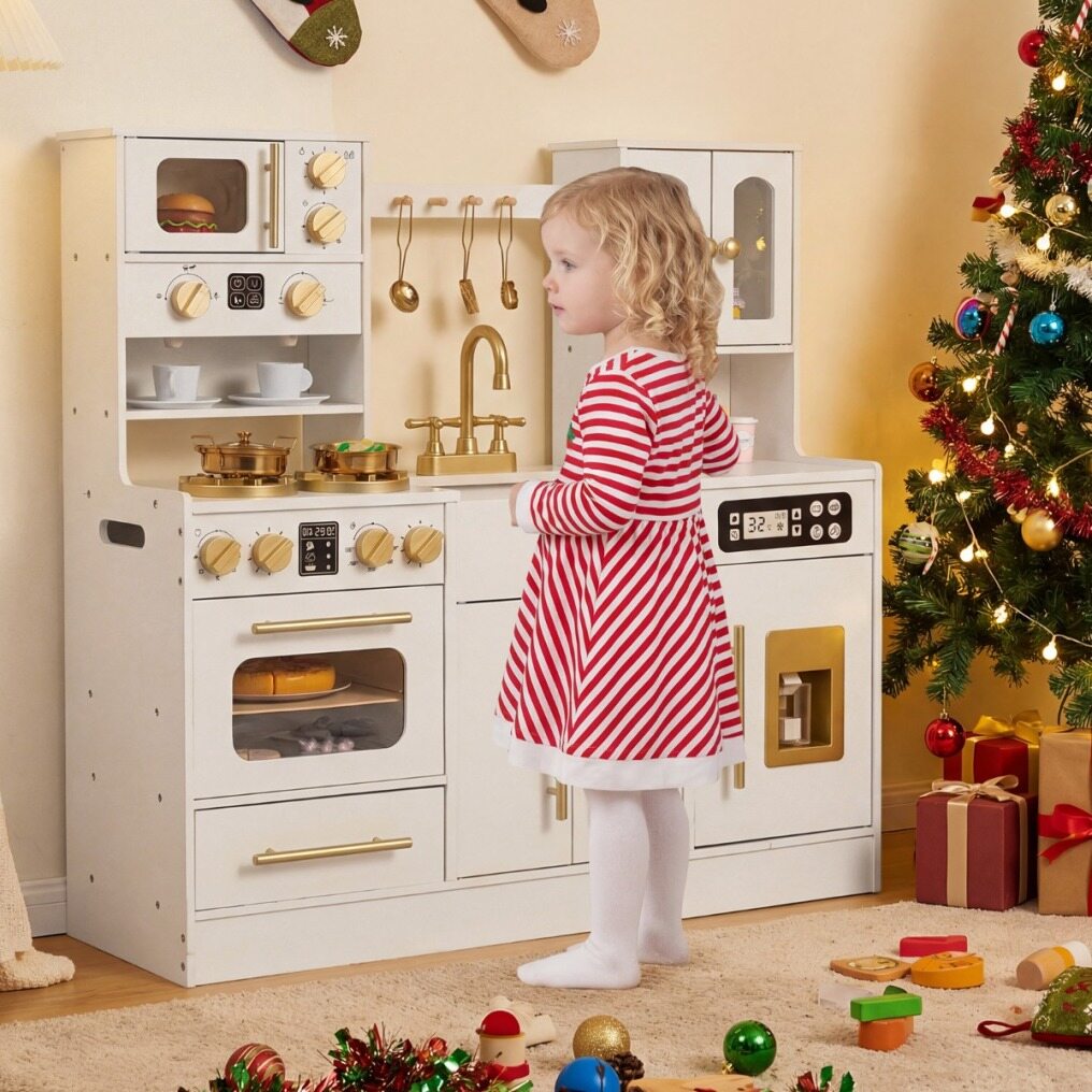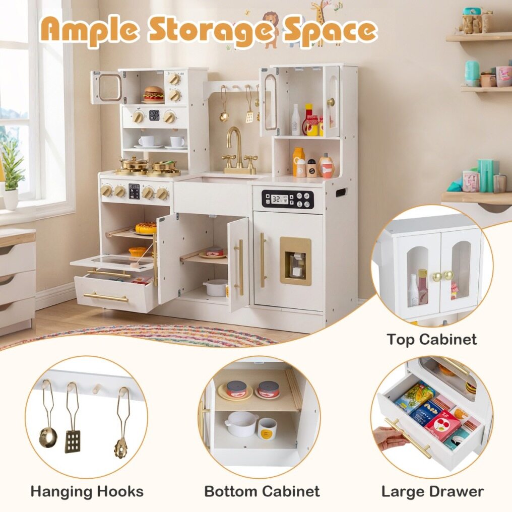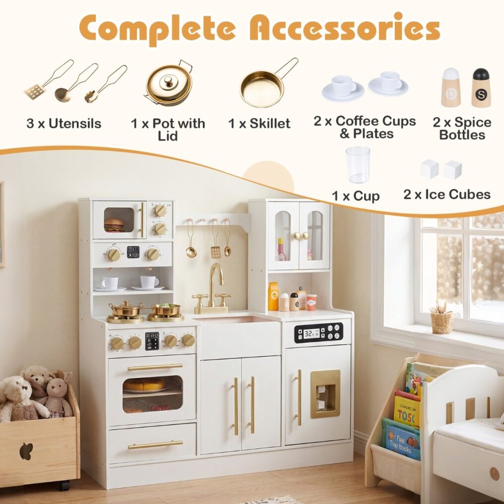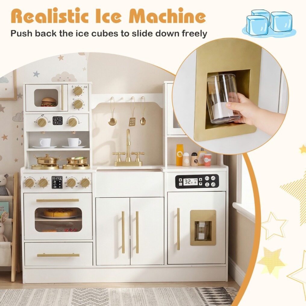 The stovetop features lifelike lights and sounds that engage children with hands-on play, mimicking real-life cooking activities. Turning knobs click satisfyingly to add to the authentic feel. The ice machine dispenses pretend ice cubes, while the microwave, coffee maker, and oven are designed for creative meal and drink preparation. A pretend sink and faucet encourage role-playing around kitchen chores like cleaning. Built with sturdy support legs and rounded edges, this kitchen playset ensures safe and stable play space. Complete with a full set of cookware accessories and ample storage space, this toy kitchen set enriches kids playtime.
