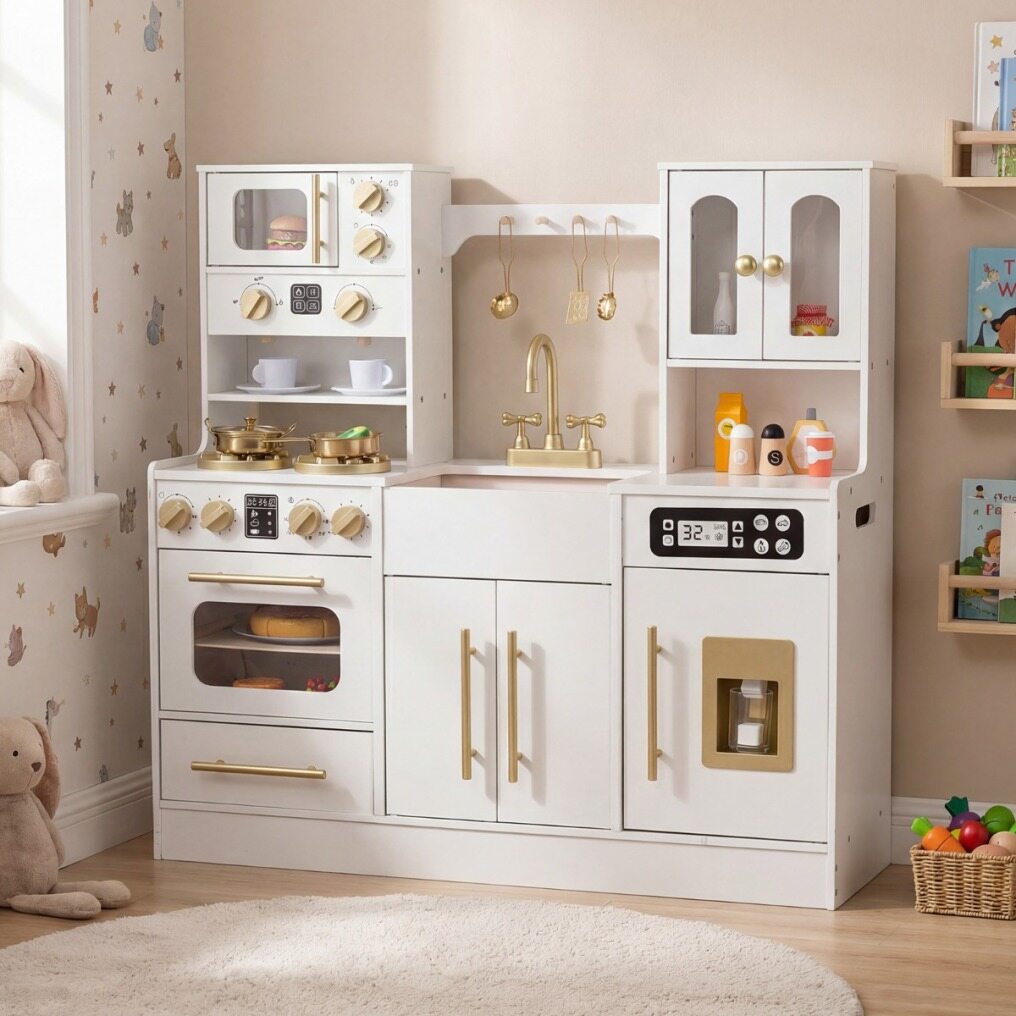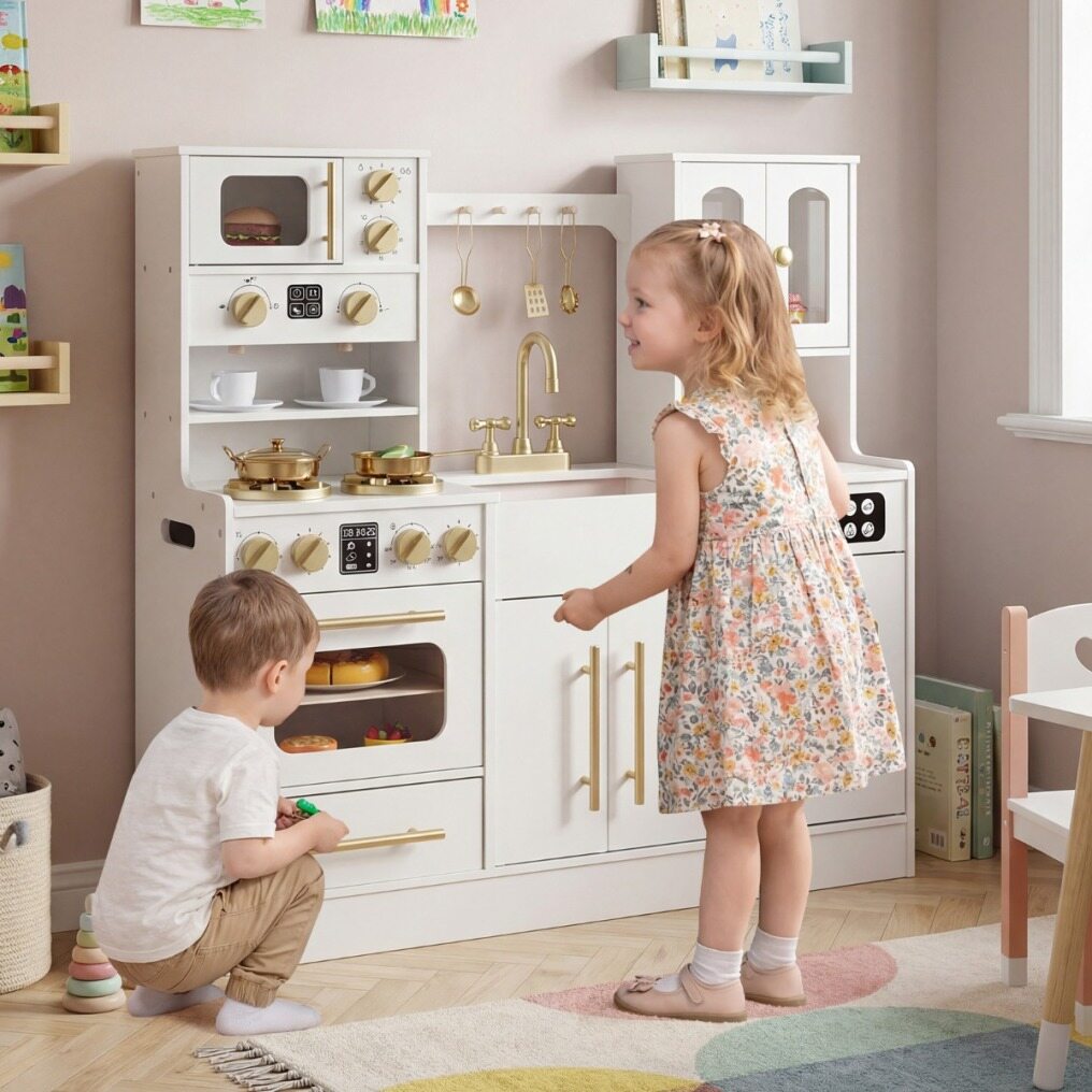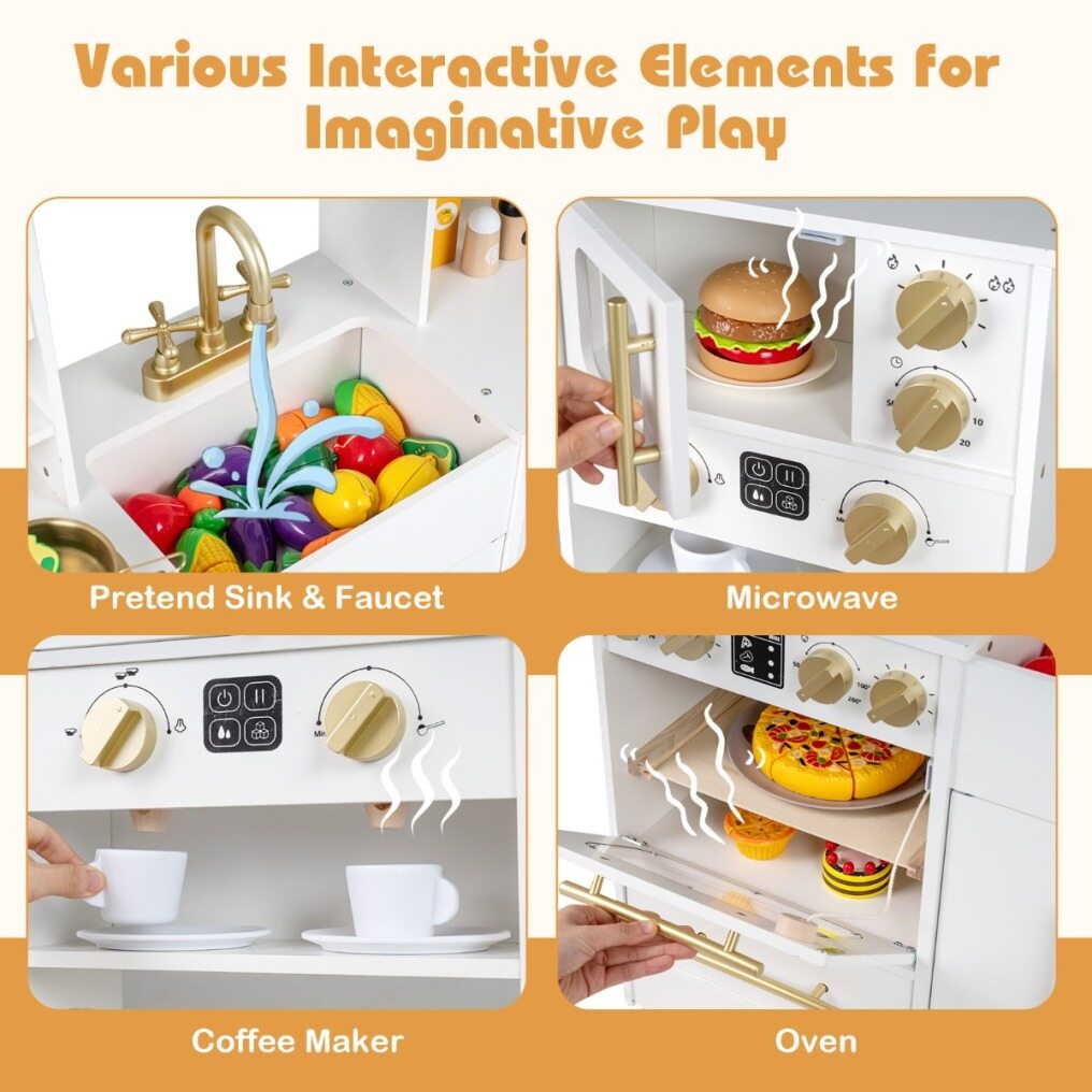 Child-Friendly Design: Thanks to sturdy base, this toy kitchen ensures a stable and safe play space for children. The rounded edges and splinter-free surface give parents peace of mind during playtime. Complies with ASTM and CPSIA, higher security is ensured.