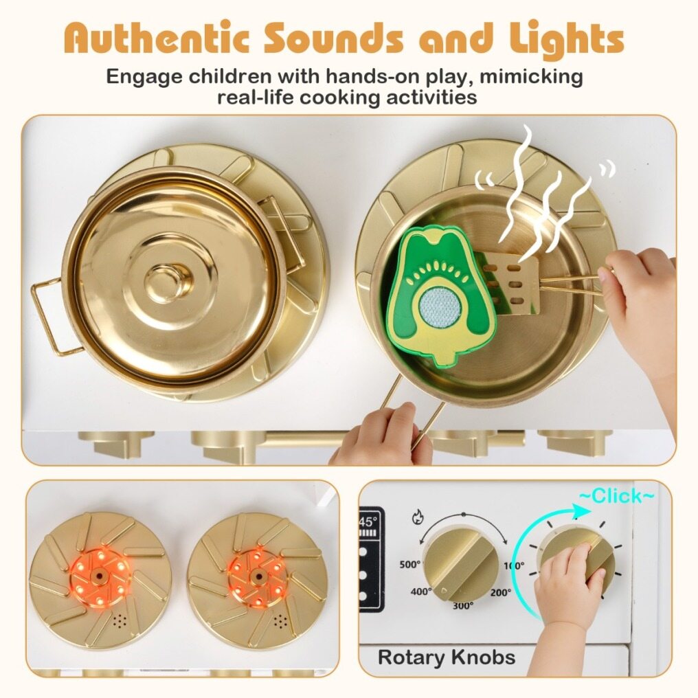 Immersive Sound & Light Effects: This wooden play kitchen is equipped with a stovetop that lights up and produces realistic cooking sounds, enhancing the pretend play experience. The rotary knobs click with each twist, inspiring active engagement.