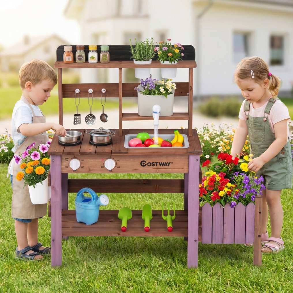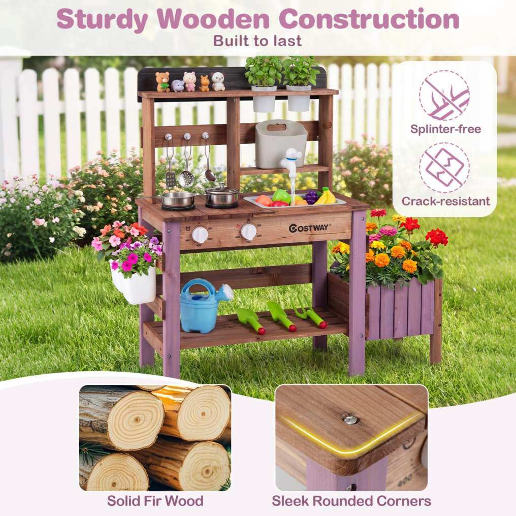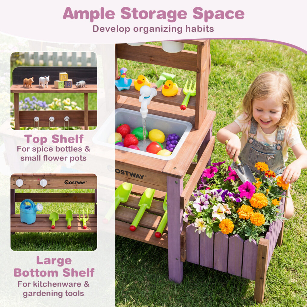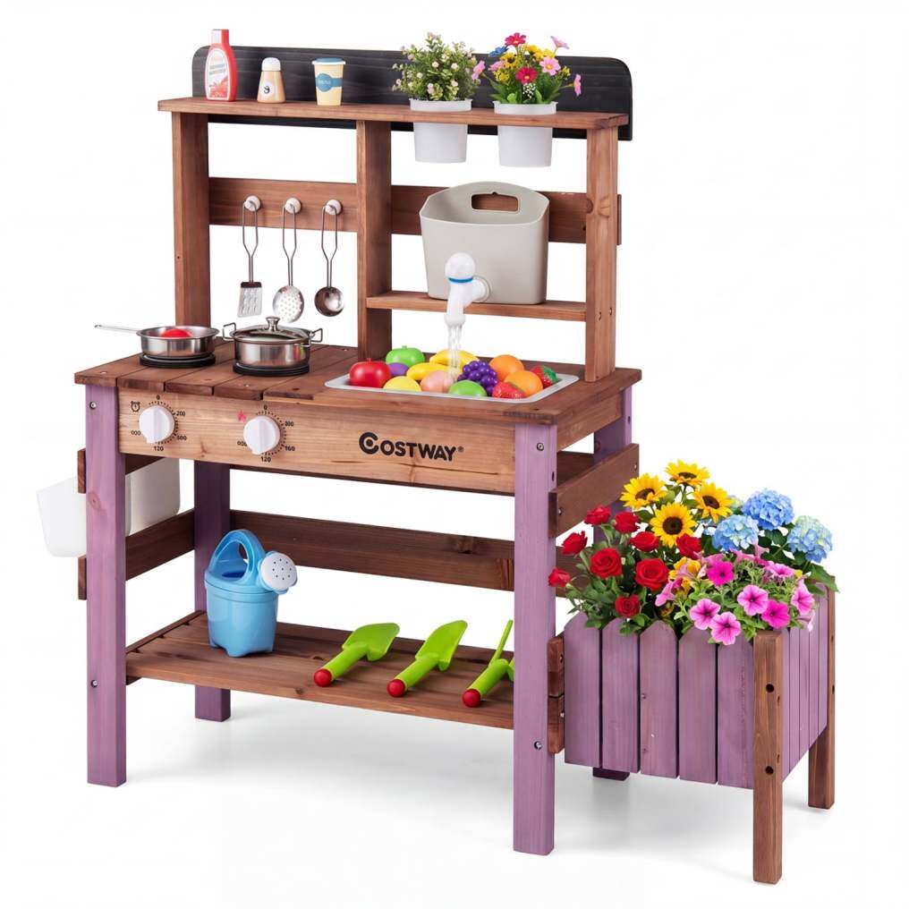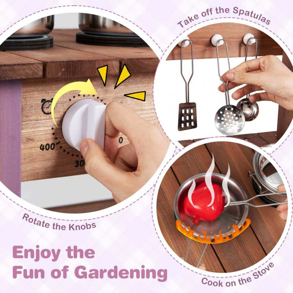 ● Enjoy Cooking & Gardening: This play kitchen set fuels imaginative role-play with an integrated stove and rotary knobs. The side planter box and removable flower pots transform it into a mud table playset, blending cooking fun with gardening activities.