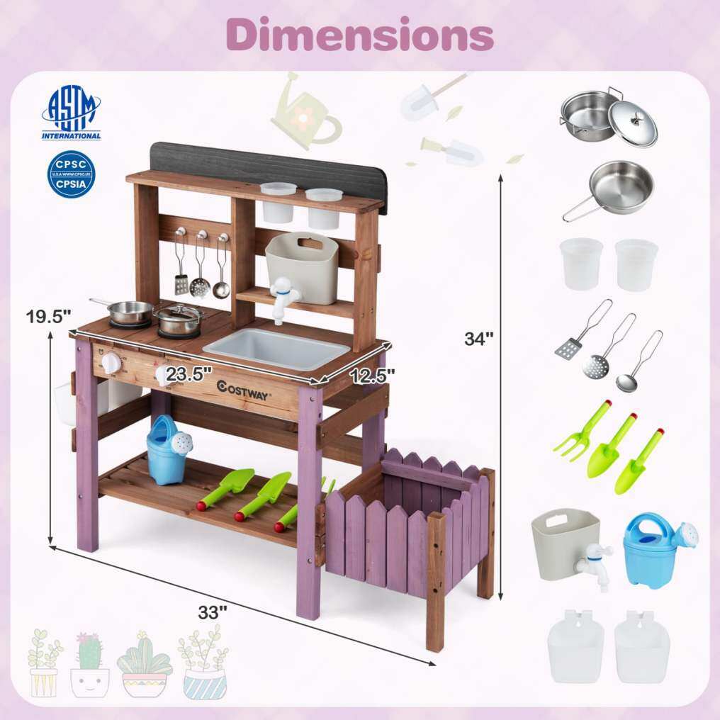● Robust Fir Wood Construction: Crafted from splinter-free and crack-resistant fir wood with rounded corners, this wooden play kitchen for kids is built for safe, long-lasting use. It fully complies with ASTM and CPSIA safety standards, giving parents peace of mind during outdoor play.