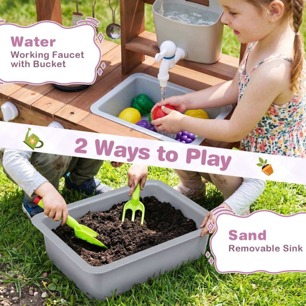 ● Dual-Use Sensory Toy: This outdoor mud kitchen features a running water faucet and tank for realistic washing and watering fun. The removable sink also holds sand, making it a versatile 2-in-1 sensory station for backyard exploration.