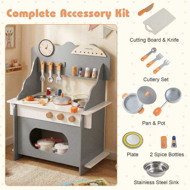 ● Stress-Free Storage: Everything has its place with a top spice rack, spacious countertop, 3 hanging hooks, and lower storage compartment for accessories. Kids learn to keep their play space tidy, building real-life organization skills while having fun.