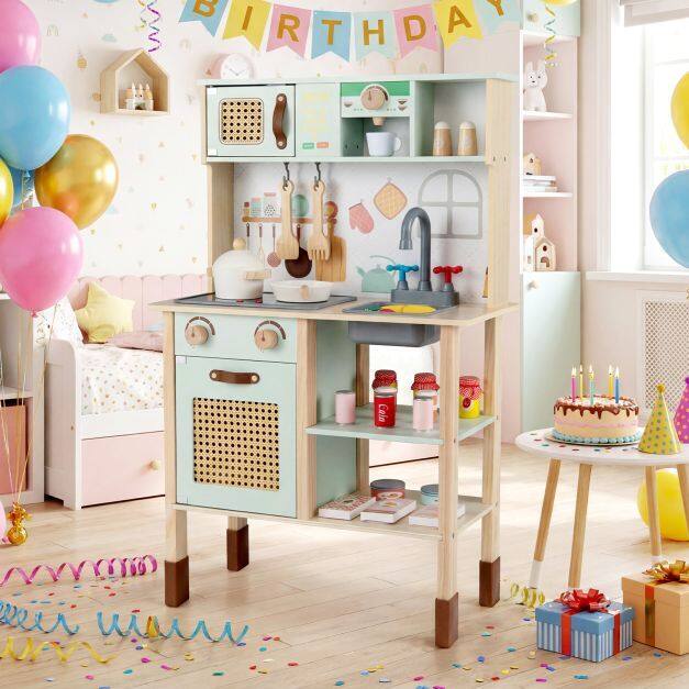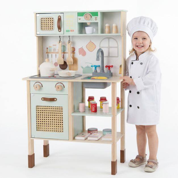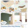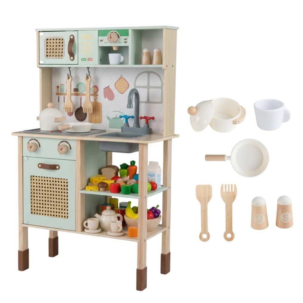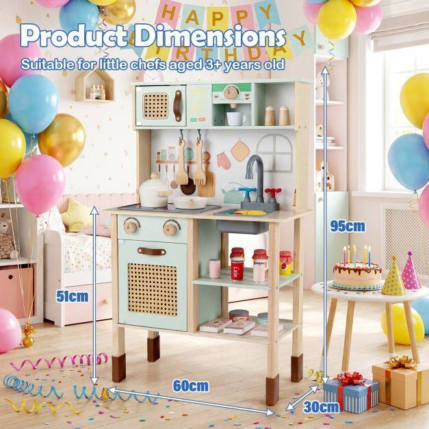 ● Focus on Little Ones' Safety: With its rounded corners and pine wood legs equipped with protective covers, the ASTM/CPSIA compliant wooden play kitchen for toddlers prioritizes safety and ensures reliable stability. Moreover, constructed from sturdy wooden boards, this play set also offers long-lasting use to accompany kids' growth.