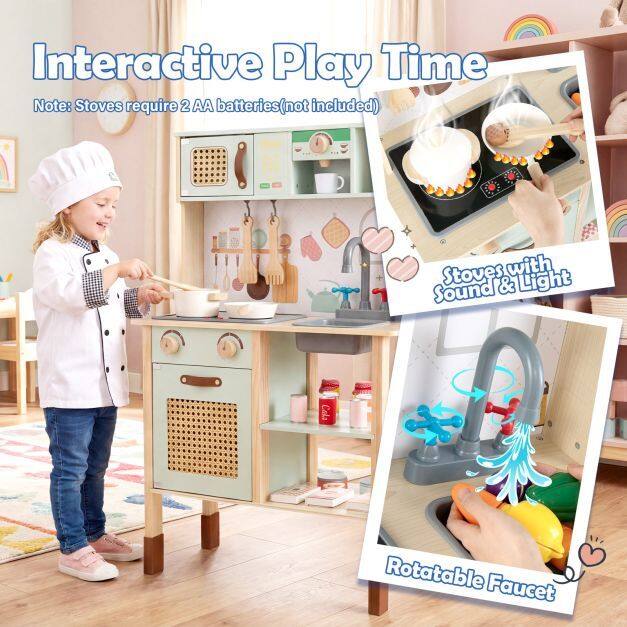● Interactive Play Time: The kids play kitchen is a hub of activity, featuring a rotatable faucet and stoves that light up and make sounds, simulating a real cooking environment. Plus, this interactive design helps ignite little chefs' creativity and imaginations, making their playtime both entertaining and realistic.