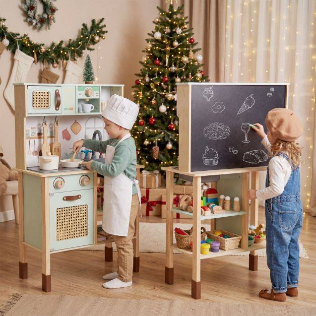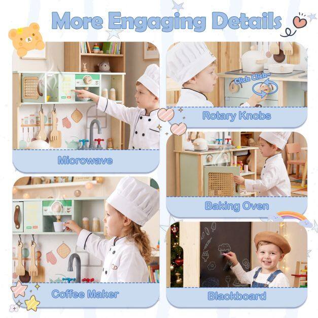 ● More Engaging Details: This pretend play set stands out with its thoughtful extras like a microwave, baking oven, coffee maker and a blackboard for jotting down the cooking menu. Moreover, multiple storage options, including seasoning sliding hooks, a seasoning compartment and open shelves, tidying up little chef's kitchen tools.